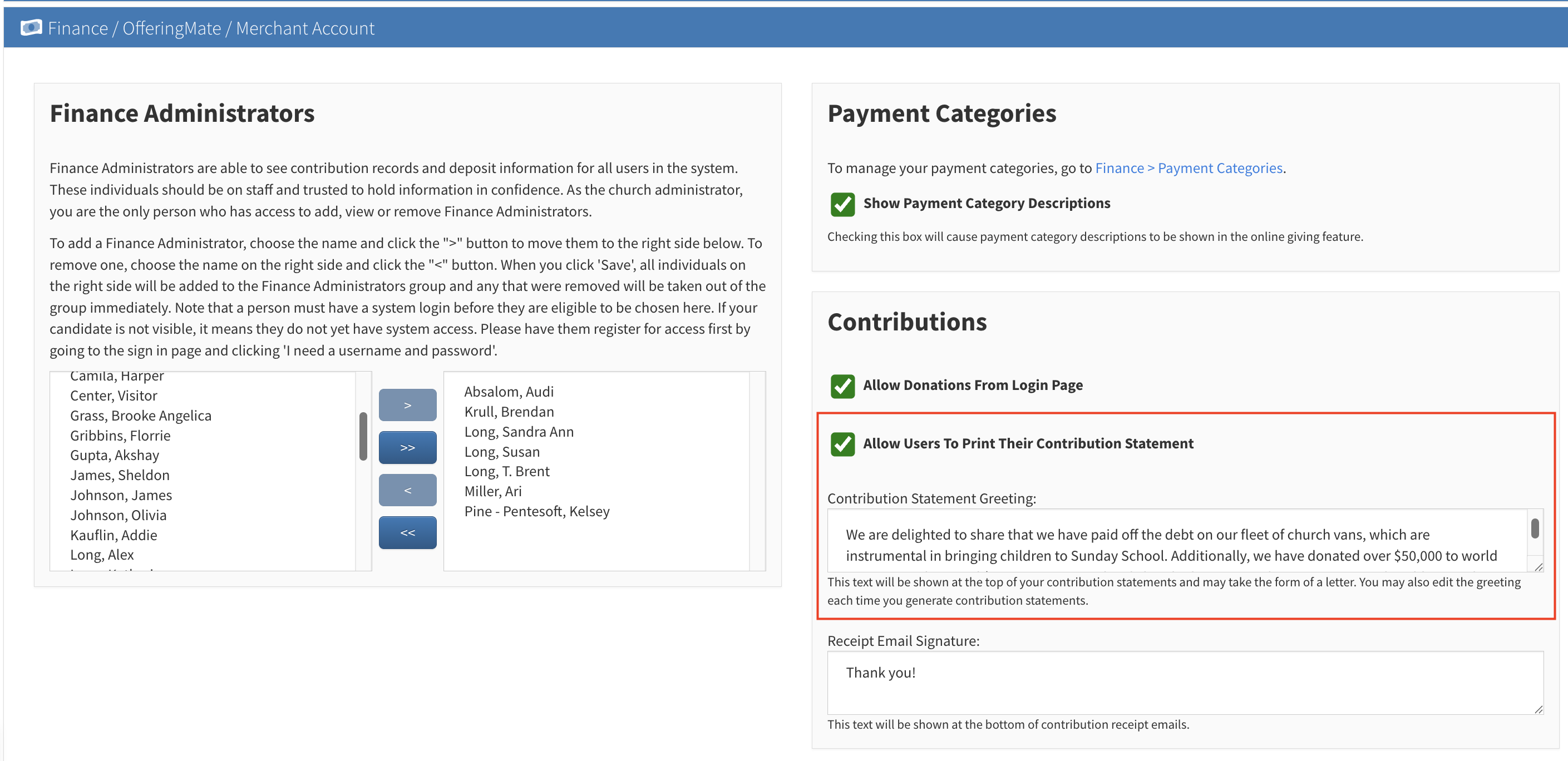 Prepping for tax season? Before you generate contribution statements, you'll want to check your settings. This article explains how an organization administrator can allow church members to print their own contribution statements and how to update the greeting that appears on those statements. It also includes a quick tip for checking duplicate profiles before printing.